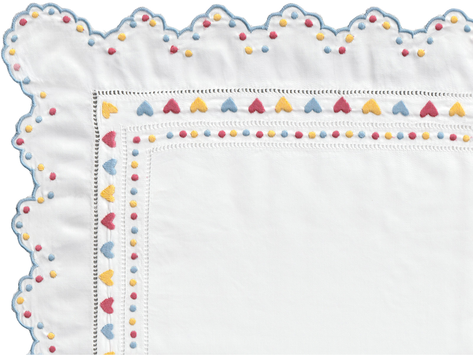 The sweetest setting for baby, outside of a loving embrace, is created by sensitive hand craftsmanship on 600 thread count, Egyptian cotton sateen from Italy. Tiny dots and miniature hearts are hand-embroidered among rows of hand hemstitching, bordered with scallops of mini scallops. Imported in White with Blue, Pink or Multicolor. Fitted sheets are solid white 600 thread count sateen. Matching mom & dad bedding also available!!! :-)