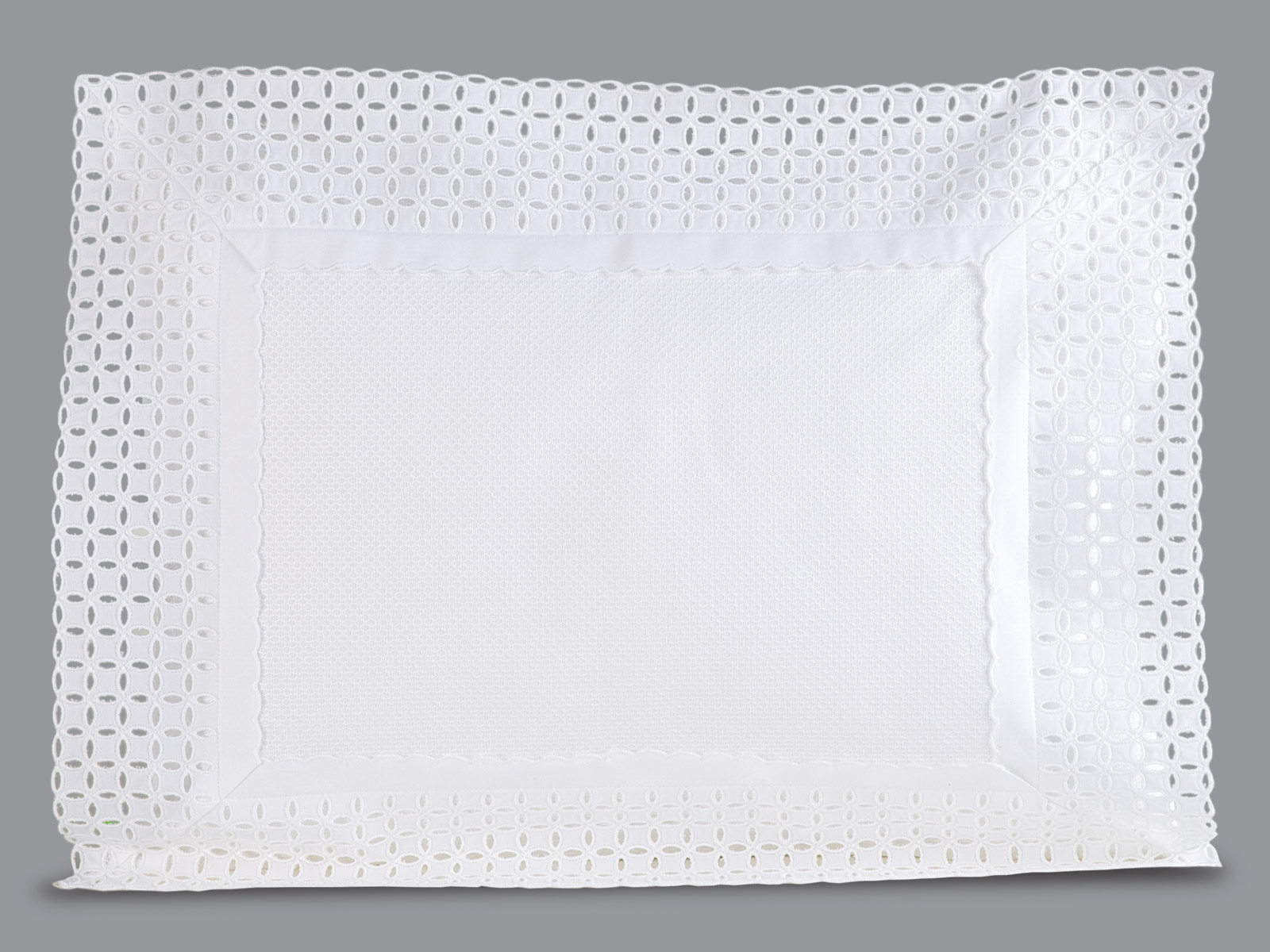 As fresh as the dawn of a new day, crisp White 300 thread count cotton percale sheets, shams and duvet covers are edged with wide and wonderful scalloped overlays of charming eyelet embroidery, where cut-outs form delightful petal-like illusions. Matching 100% Italian cotton piqué blanket covers and shams complete the extraordinary look. Made in Italy with love.