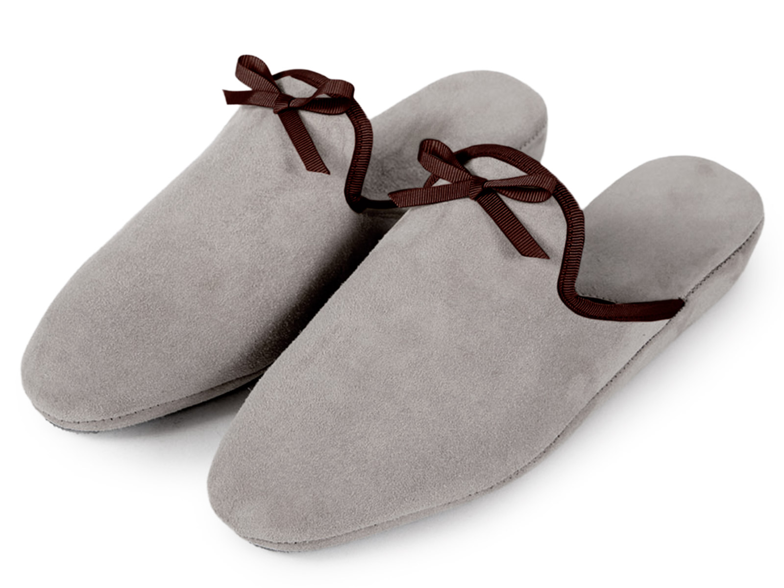 Functional and fashionable, these suede slippers are designed to make you—and your feet—happier every day. Silky-soft natural lining keeps you comfortable as you go about your routine. The chic Oyster hue and rich Chocolate-brown grosgrain ribbon add sleek, contemporary charm. The outsole comes in suede with rubber soles, offering cozy support for cold floors and quick trips to the mailbox. Made in Spain.