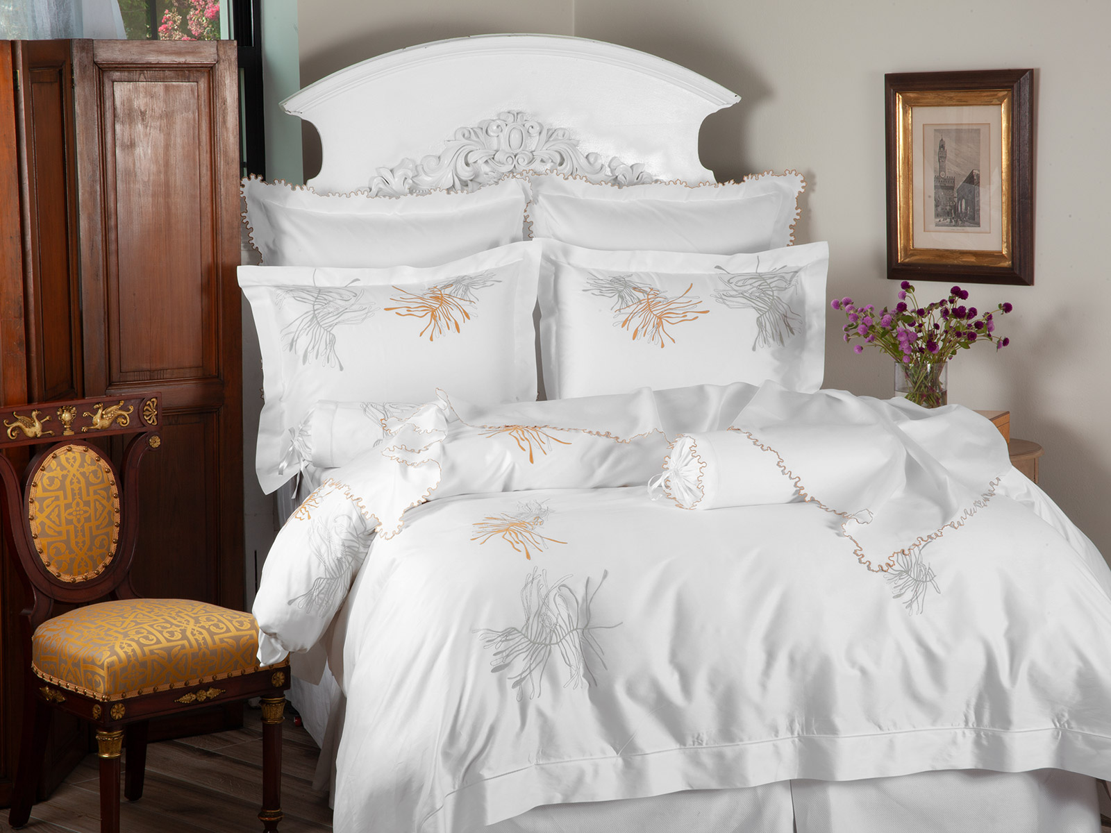 Simple, stunning, and brilliantly executed—your bedroom will thank you for ushering in this uncommonly beautiful set. Featuring the soothing natural flow of our original design and masterful bursts of contemporary elements, this piece adds a calming feel to your space, while also giving it an interesting and elevated new look. All this beauty is bestowed on a soft bed of 600 thread count, 100% Egyptian cotton sateen to coddle and comfort you every time you use it. And since it just keeps getting softer with every use, each experience just keeps getting better. Imported.