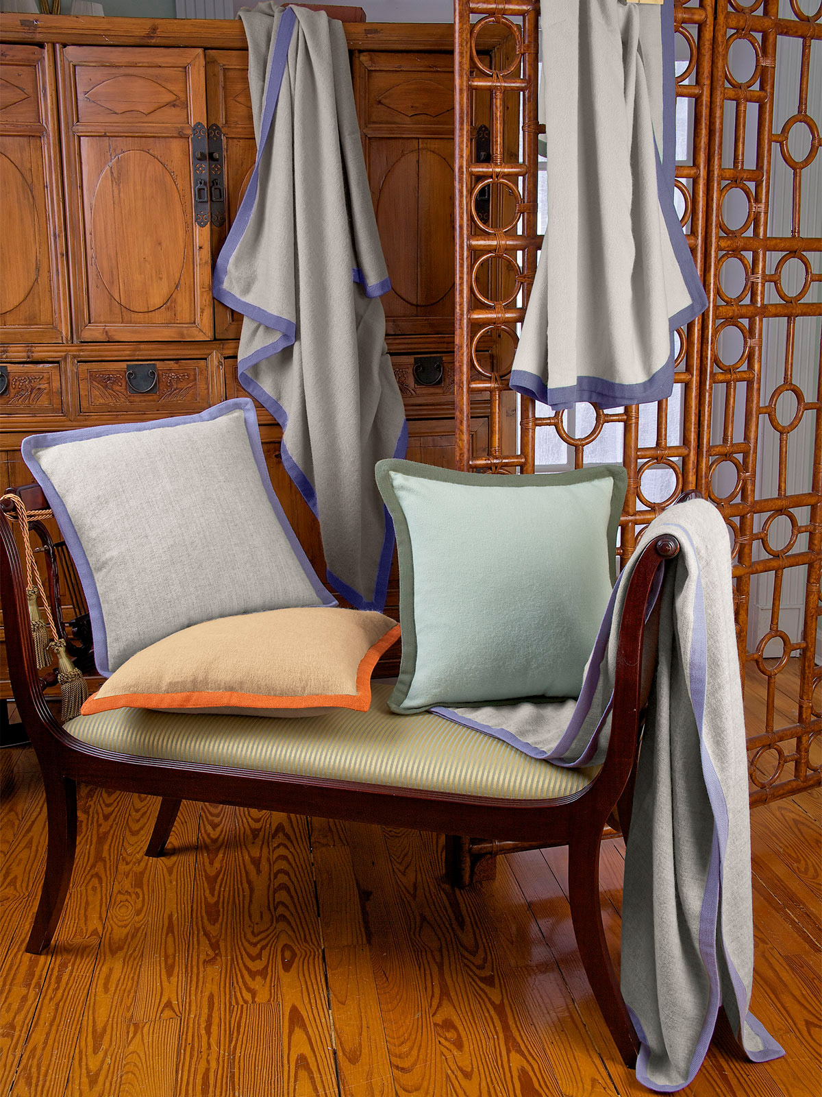 Renowned all over the world for its sumptuous softness and lightweight warmth, 100% pure baby alpaca creates one of the most coveted throws imaginable. Made with pride in Peru, it's generously sized for immeasurable luxury, with contrasting Gray/Lavender knit borders all around. Perfectly beautiful, with matching pillows filled with 95% feathers, 5% down, in Gray/Lavender, Beige/Terracotta or Aqua/Moss Green. Dry clean only.