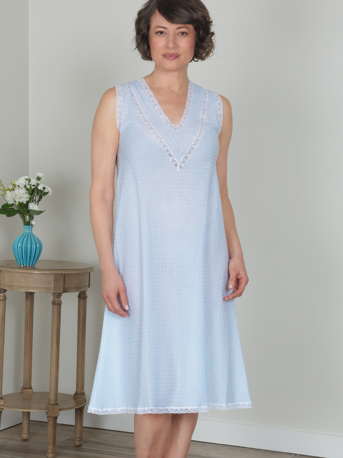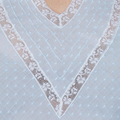 Sophisticated nightgown crafted for Italy in premium Blue dotted-Swiss fabric. Ultra-light and breathable, it features refined white lace trims and a modern A-line cut for a fluid drape. Designed for elegance and comfort, with a relaxed silhouette that feels effortlessly luxurious.