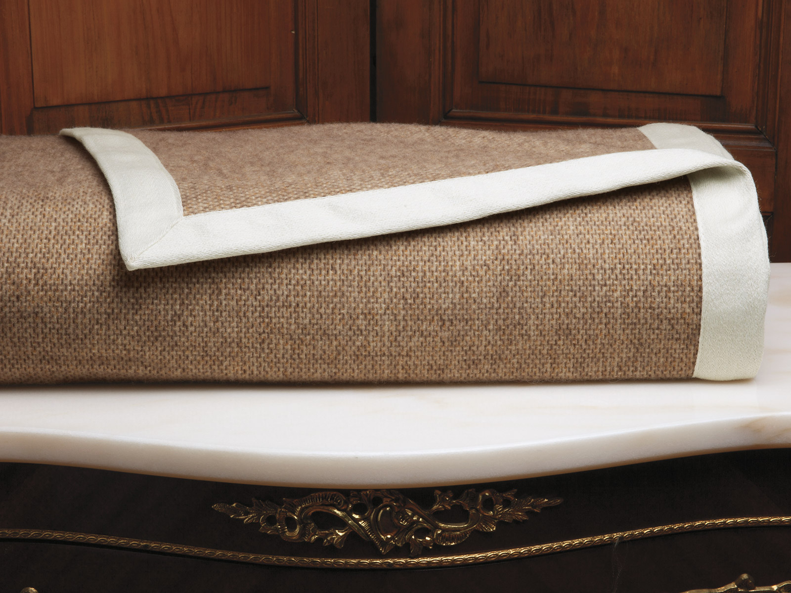 With a textured weave in 75% pure Wool and 25% pure Cashmere, you will want to reach out and experience the cloudlike softness at the very first glance. Fashioned in Italy, the blanket is finished with an Ivory band. The warmth and beauty will bring joy to your heart. Blanket is available in Melange Beige. Matching throw available in Melange Navy or Melange Red.